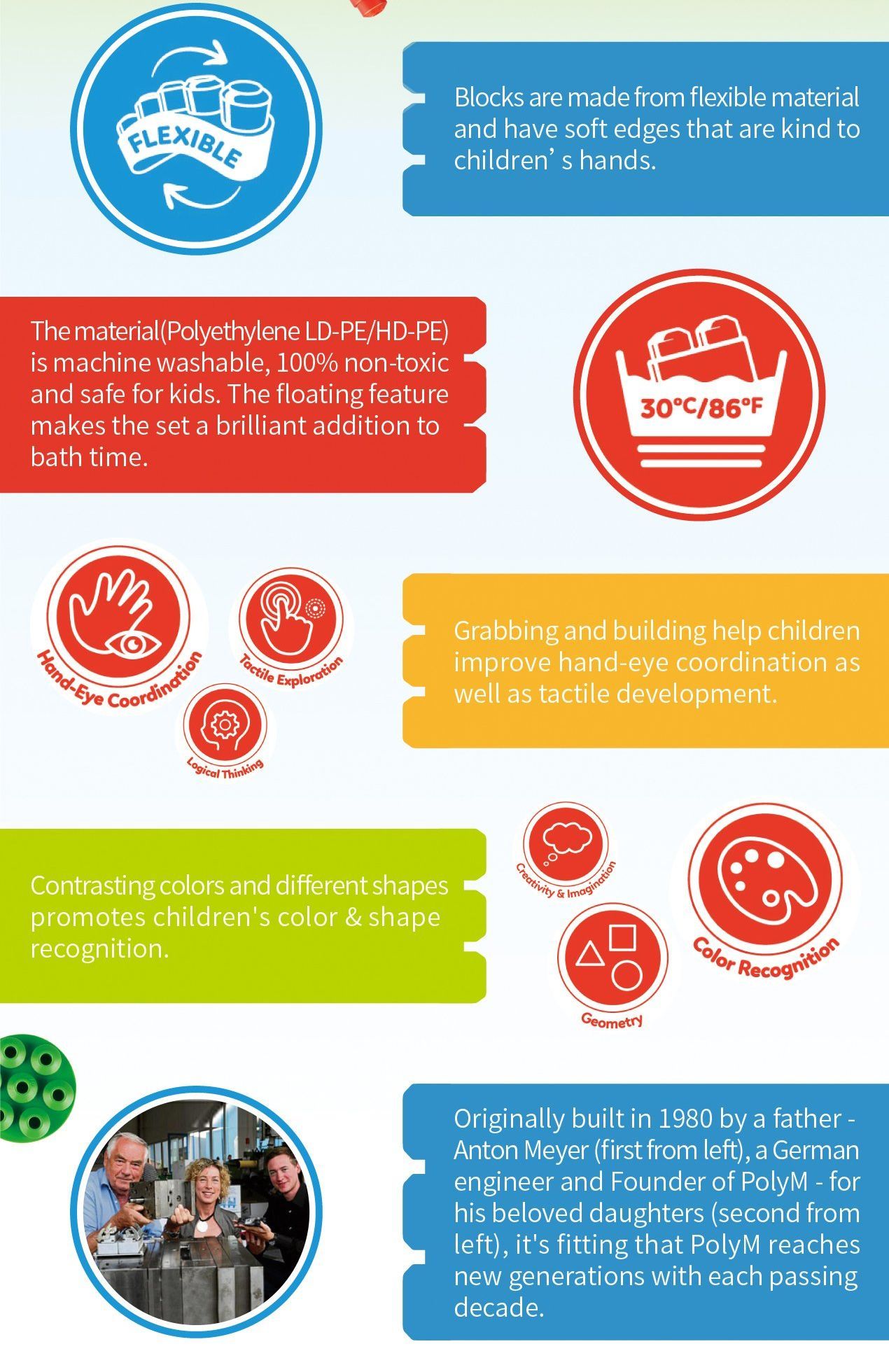 PolyM 係極佳嘅 幼兒積木 推薦,因為佢非常容易拼砌同拆開,專為小手肌力未完全發展嘅寶寶而設,能大大增加佢哋嘅成功感同玩樂興趣。而且,積木仲可以放入洗衣機清洗,清潔消毒方便又衛生!